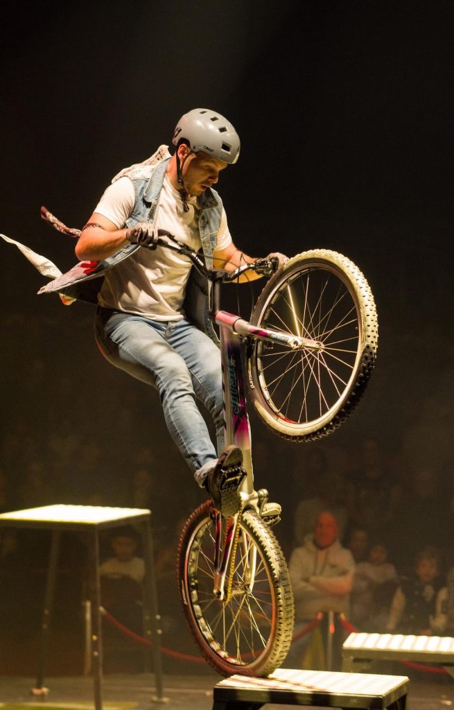 Oudere kinderen en volwassenen staan versteld door de stunts van de acrobaat op zijn BMX-fiets, de messenwerper en de spectaculaire goocheltrucs en illusies.